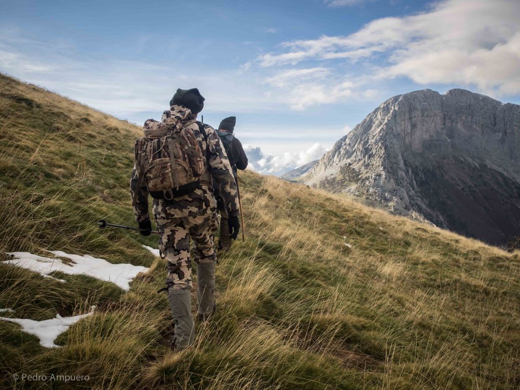 We started with a tough climb to get to the top. There was some snow already at the high peaks, but not much. Weather has been really nice in Spain this fall. After several hours, and checking that there was no game so high, we started hunting the game from above, and as soon as the snow was starting to disappear, the first group of chamois appeared.