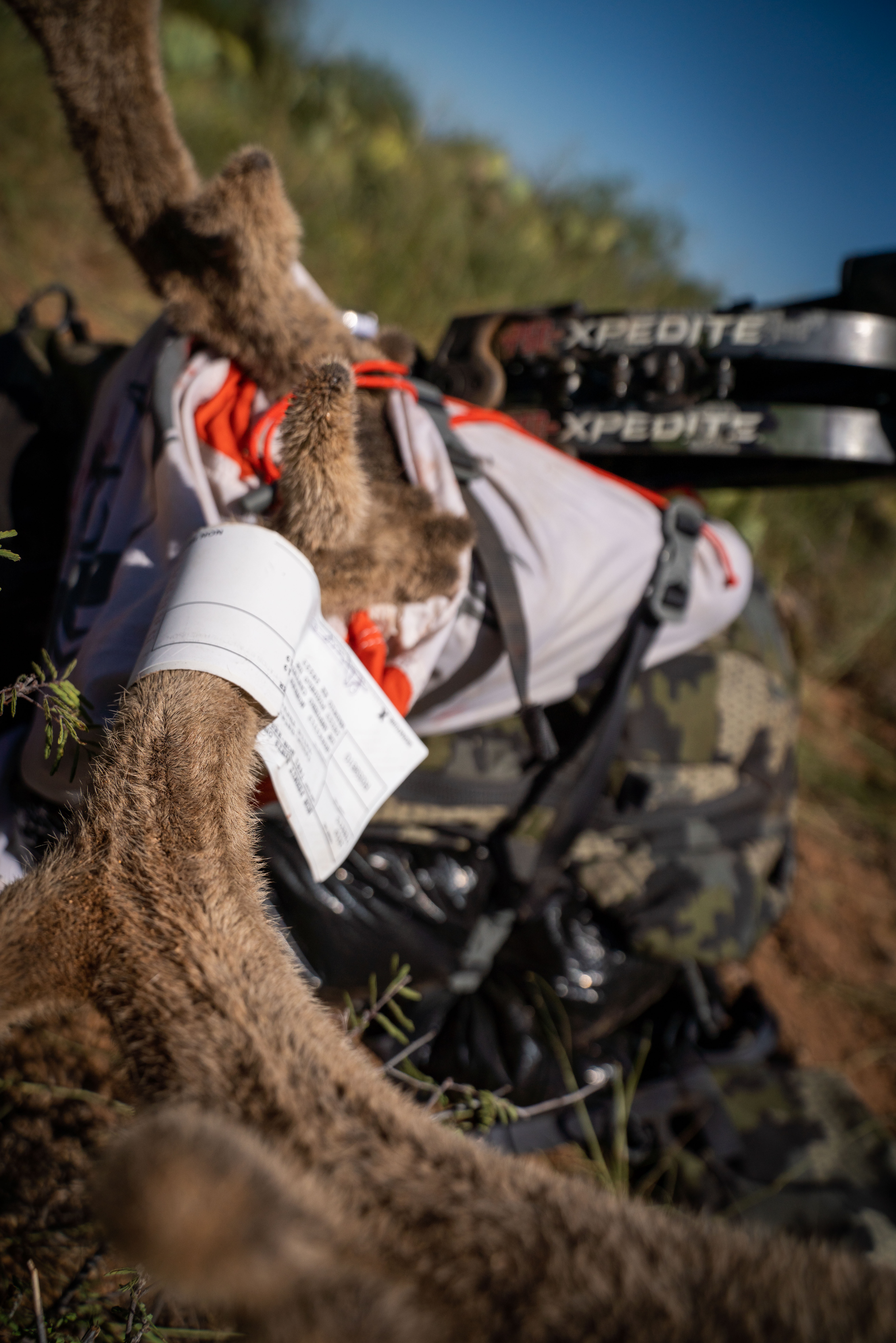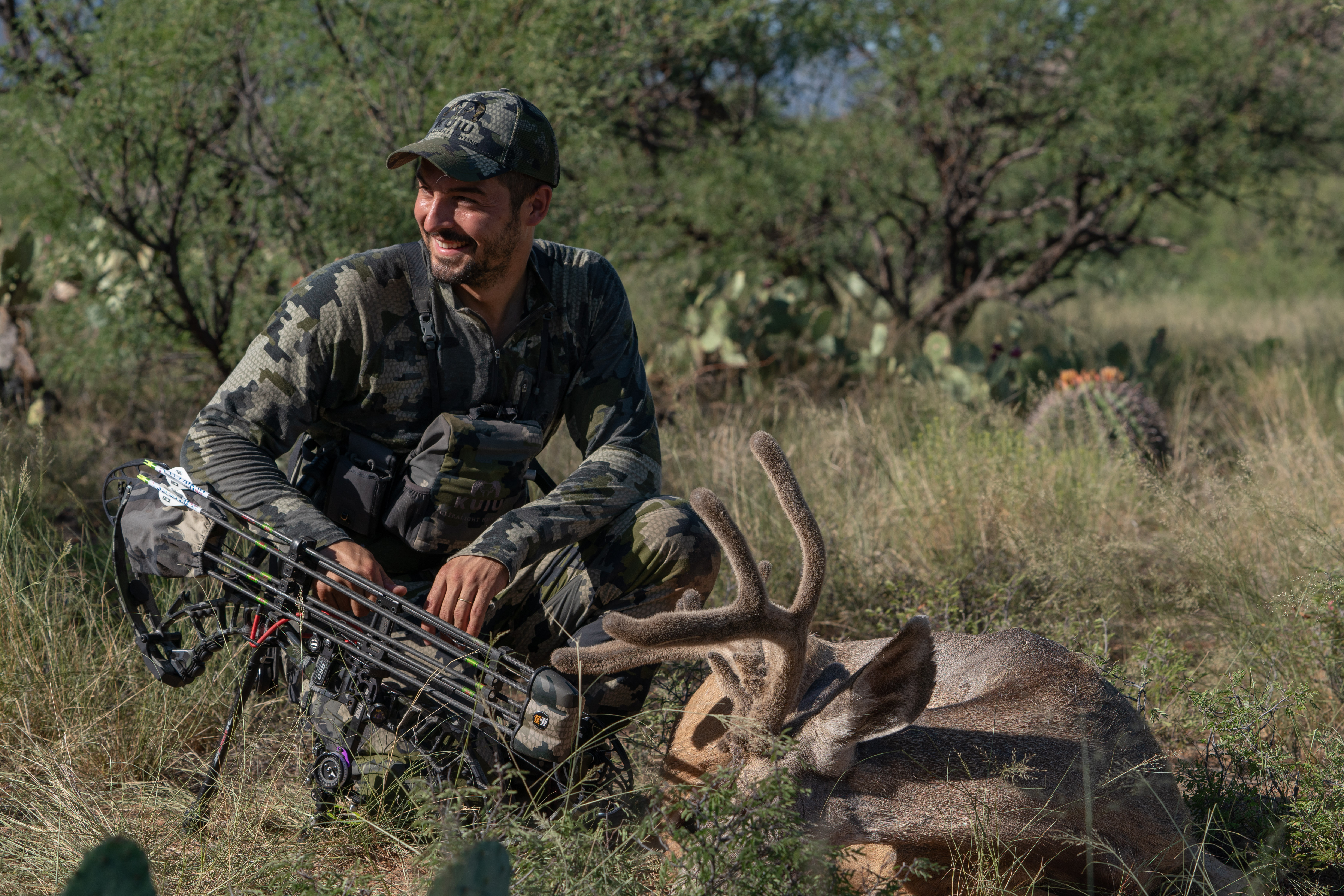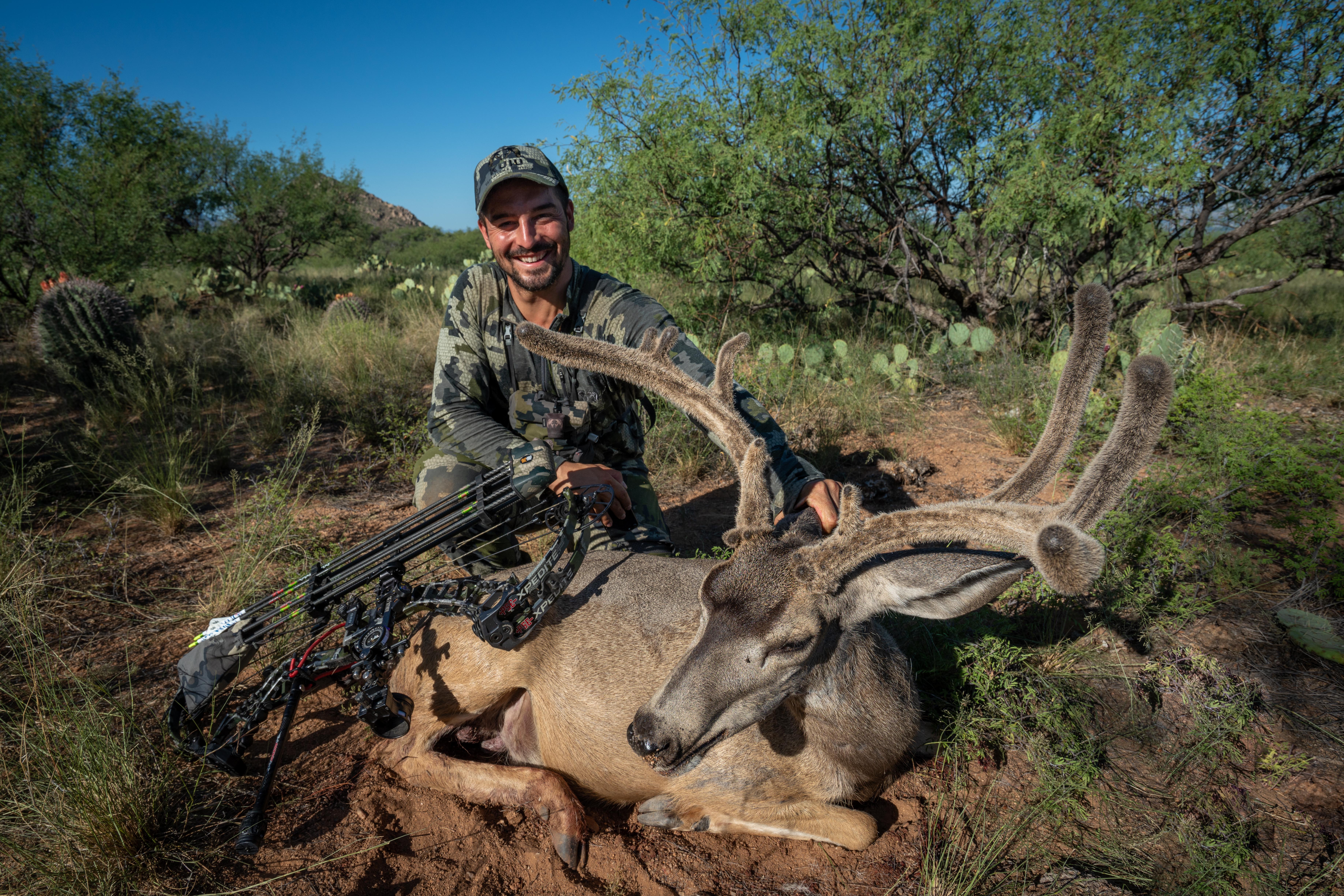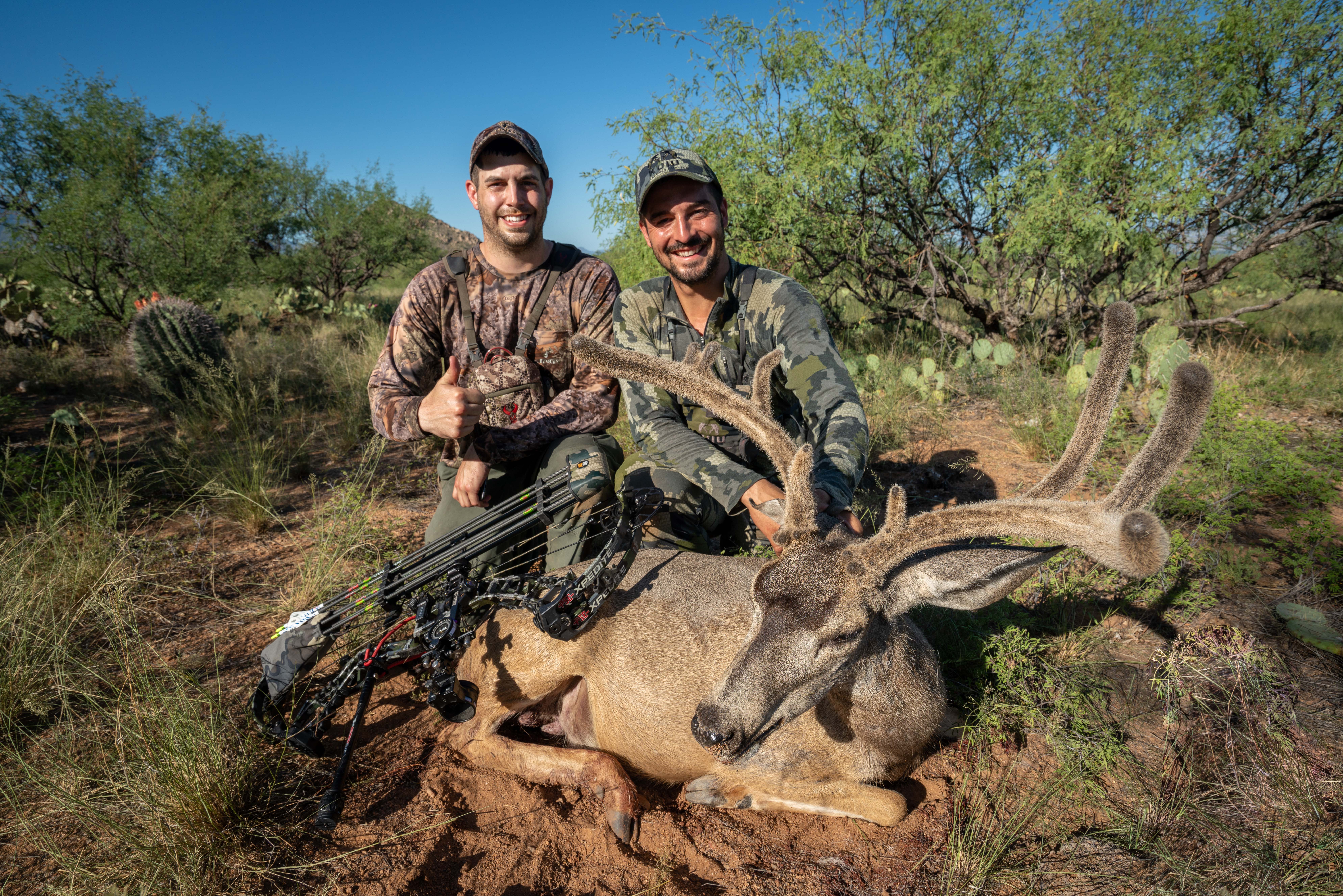 Everything came to the last afternoon of the hunt. We had already been hunting in that area for the last six days, and after a couple of failed stalks, the rapport between my partner and I was pretty good. There are no many people that you can understand each other so well as I did with Jason. We think alike and this helped a lot. I had a blaze orange shirt that I could pull to be seen easier, and already learned all the different local wildlife names, the Prickly Pear cactus, the Cholla, the Mezquite tree, Palo Verde tree,… It was getting dark and I was getting anxious but finally got a call, Jason had located a shooter buck. I literally run to the location he described to don’t lose any time. I dropped my pack and removed my boots, it was time to get sneaky. I start closing the distance slowly with a good wind and it wasn’t long when I get to see one of the bucks between the trees. I keep working my way in but I was running out of light quickly. I got to 40 yards of the three bucks but I didn’t have any clear shooting lane. It didn’t look like they were going to move anytime soon, and I didn’t have much time left. I started looking hard with my binos for a hole in the mesquite tree in front of me, and finally found one no larger than 10 inches. This wasn’t enough for the arrow arch, so I was going to have to aim with my 25 yard pin to the hole, and put the 40 yds pin on the buck. I got a deep breath and tried to align the hole with the biggest buck, the first pin with the hole and the second pin with the buck…