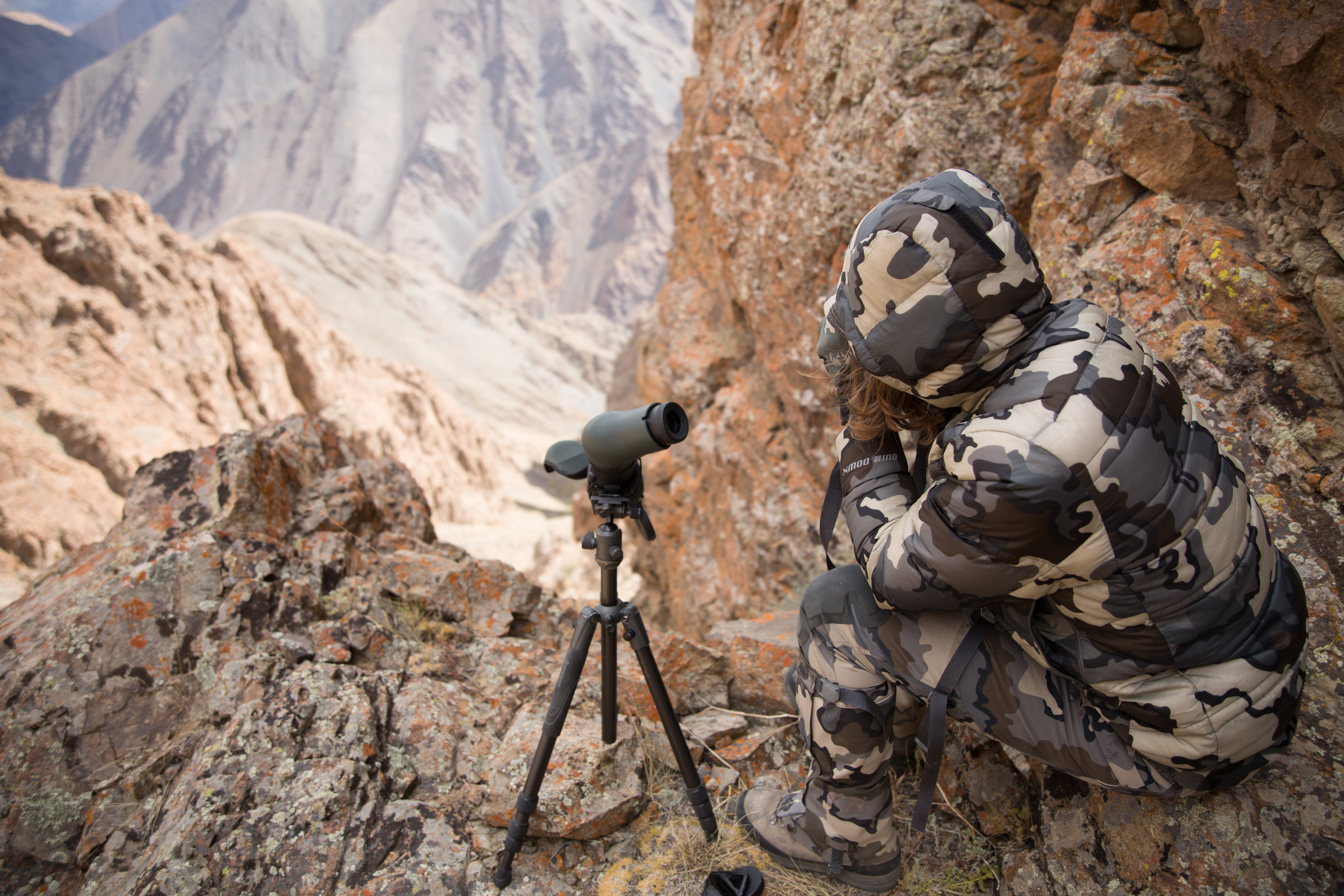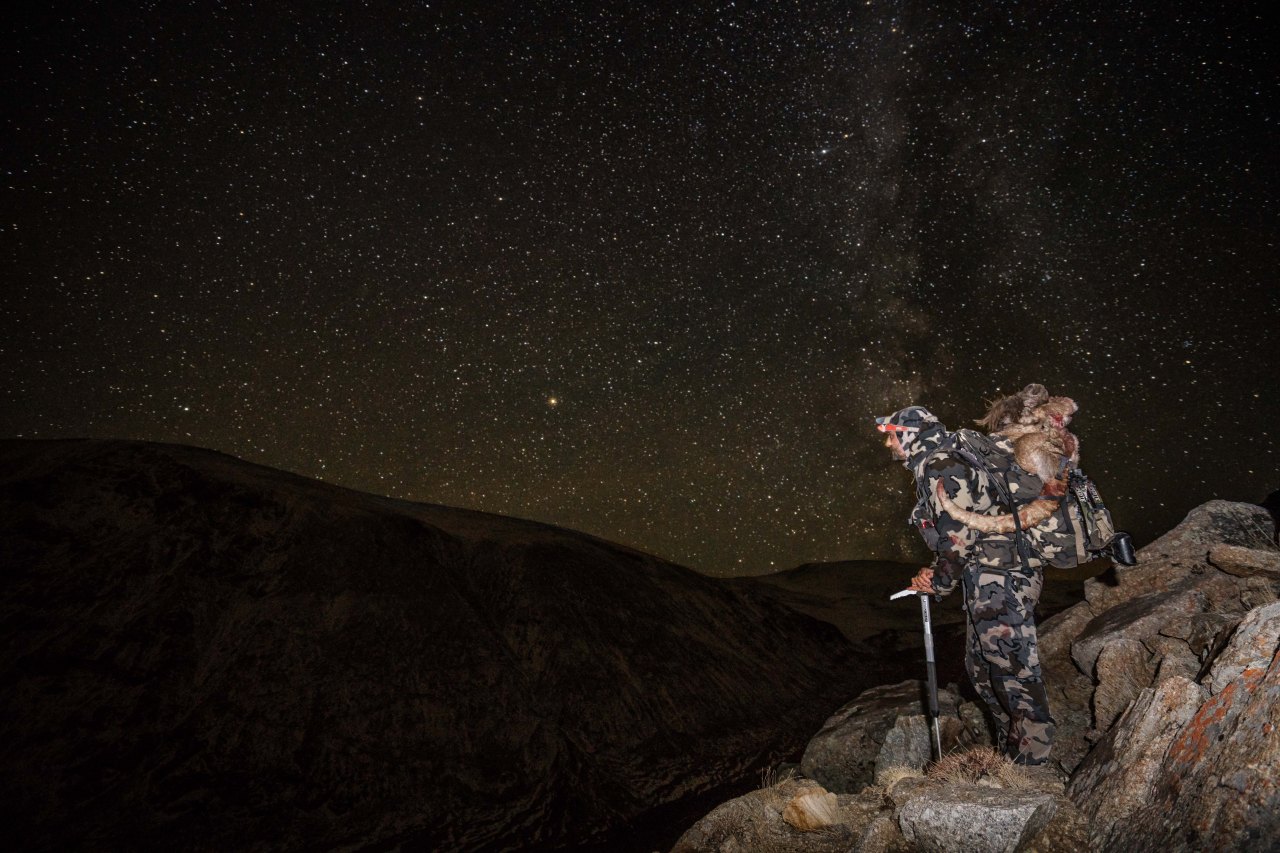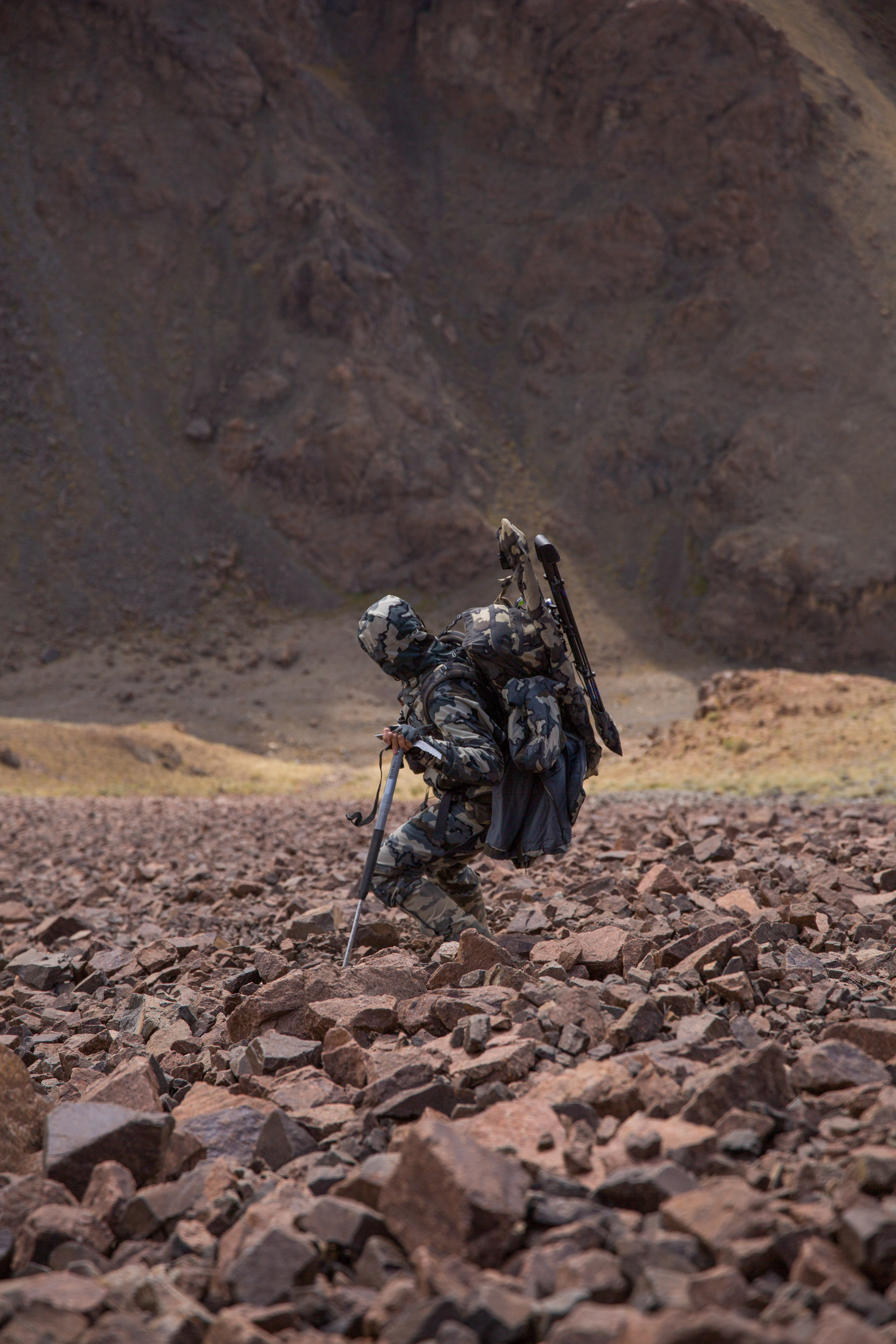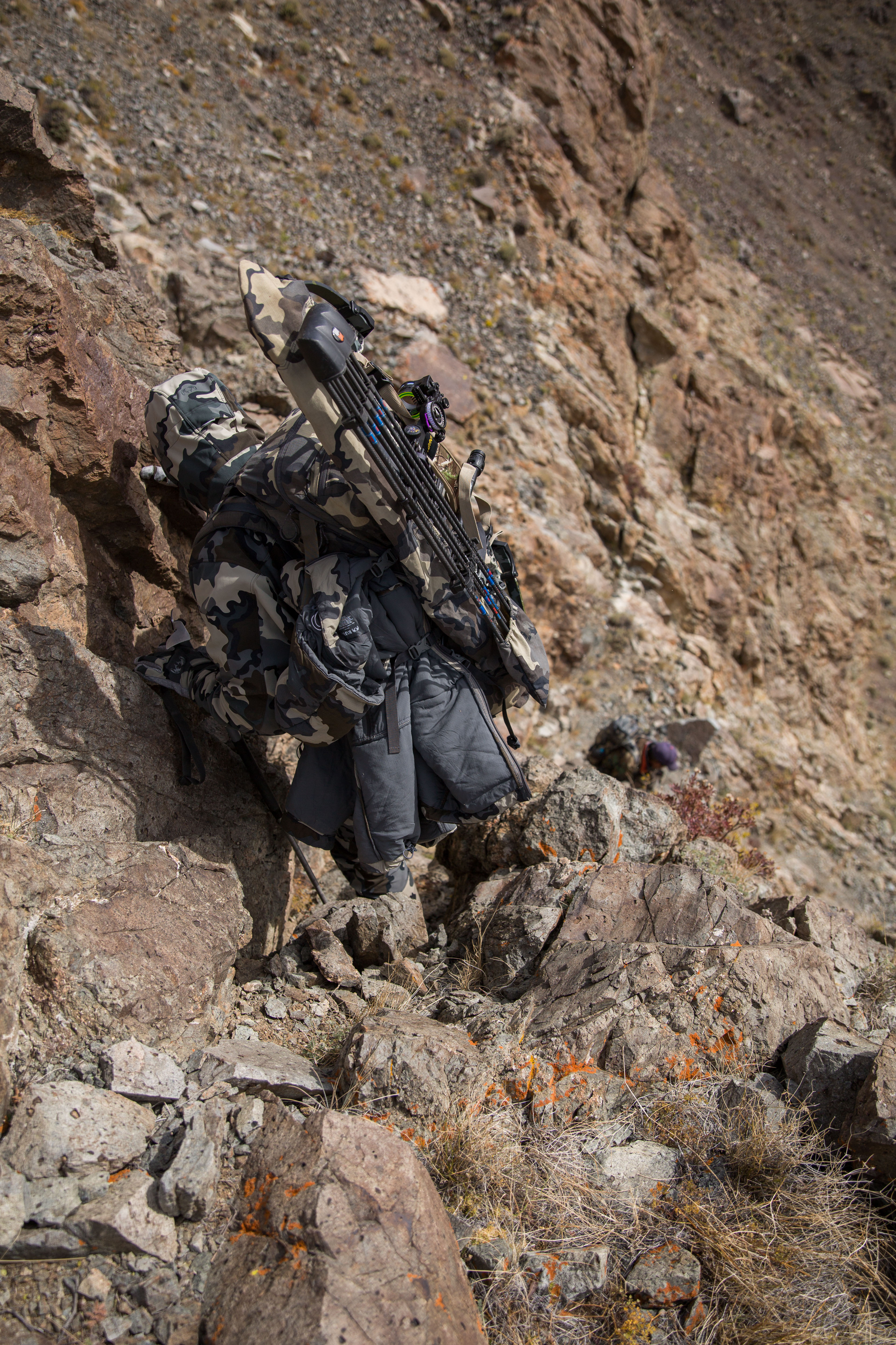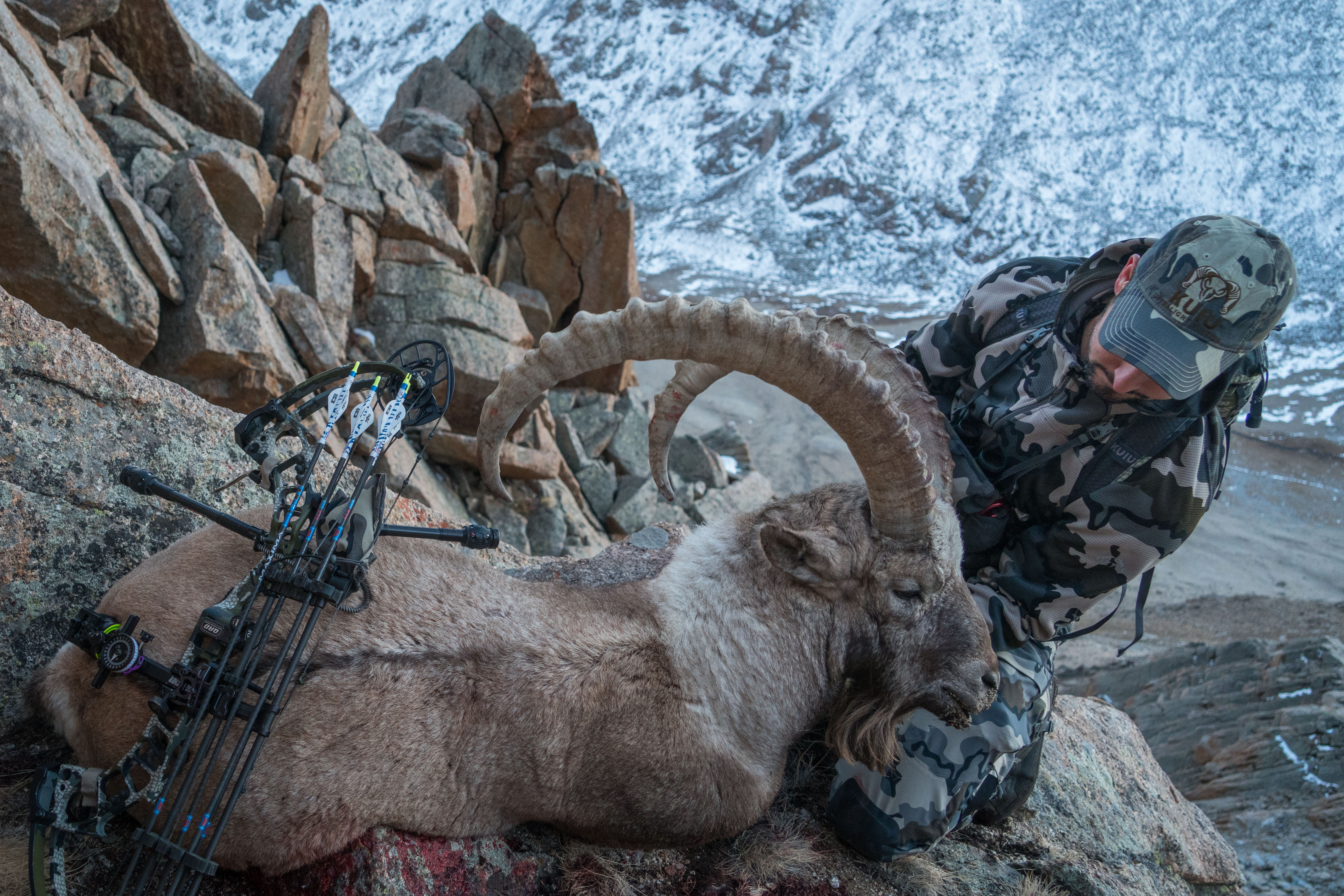 We can see the billies bedded down around 200 meters below us, and the only way is to get right above them climbing straight down the cliff. Every step is calculated meticulously, and we pass the bow between each other to be able to use both hands and feet. The risk of the climb is a little over my comfort zone, and I try to keep focused to don’t make a bad movement between the excitement and the exhaustion.